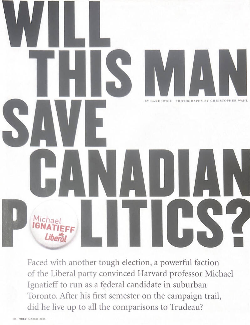 This story appeared in a Toronto Globe and Mail supplement in 2005. At that point, Michael Ignatieff was about to take his seat as a Member of Parliament representing the Toronto riding of Lakeshore-Etobicoke. From the moment he decided to leave behind Harvard to enter into politics, he had the loftiest of ambitions. Early on anyone tracking his campaign could pick up red flags that he seemed to be missing. This story won a Canadian National Magazine Award for best profile.