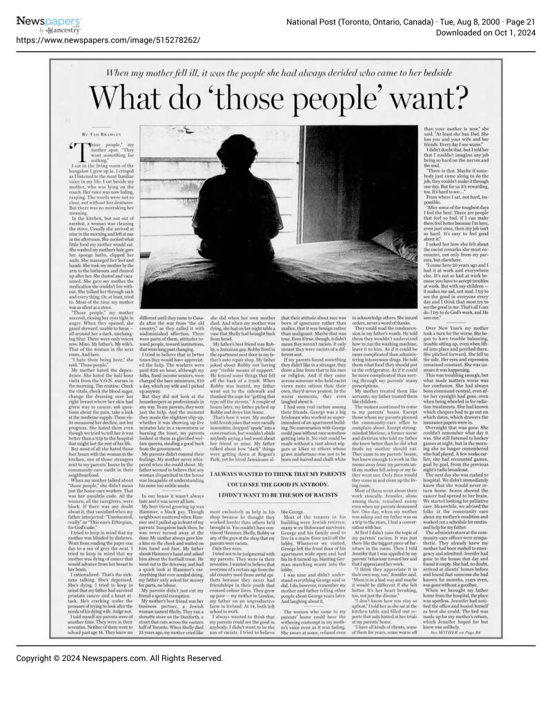 For the National Post I wrote several first-person essays under a nom de plume, Tad Bradley. The essay below was the first and focuses on my parents' racism when my mother was dying and dependent on Black caregivers.
